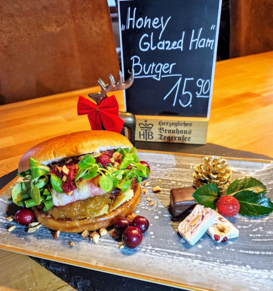 Stell dir einen Honigschinken mit einer fruchtigen Cranberry Sauce, cremigen Kartoffelgratin und salzig ,rauchigen speckbohnen auf Burgersemmel vor. Abgerundet mit Mandelkrokant für den Crunch. Eine Hommage an das Weinachtsfest, das Tradition und modernen Geschmack verbindet.